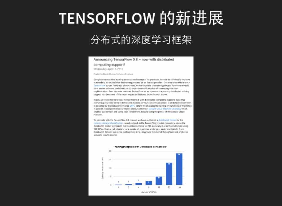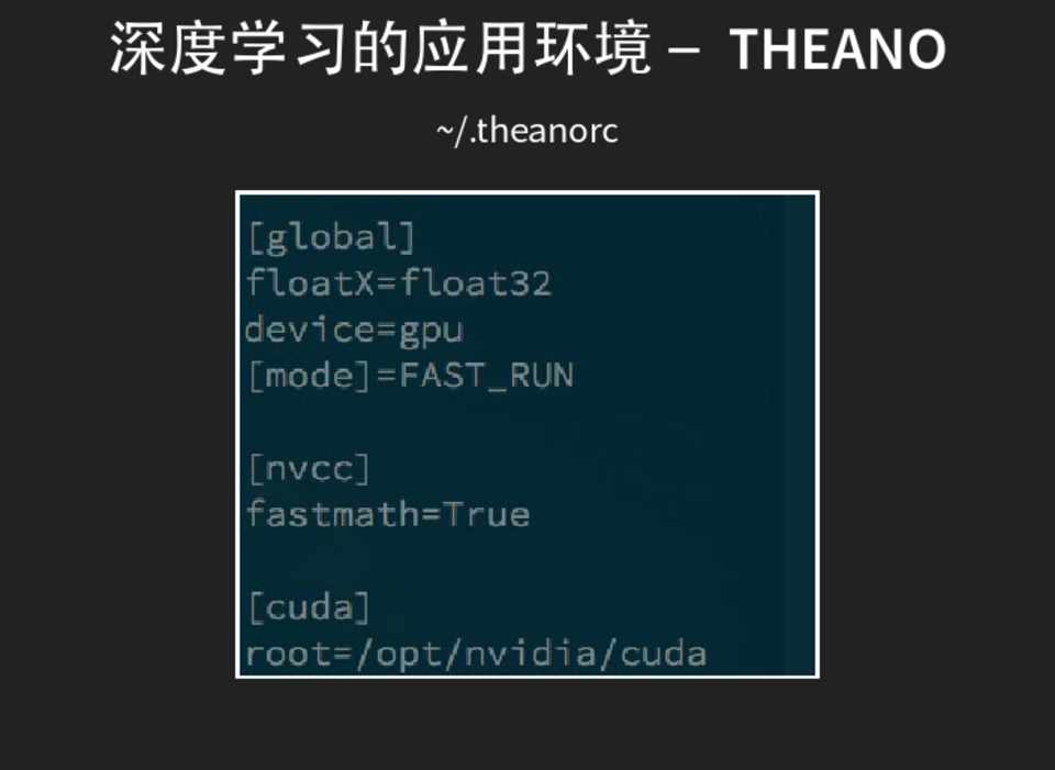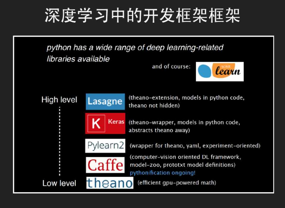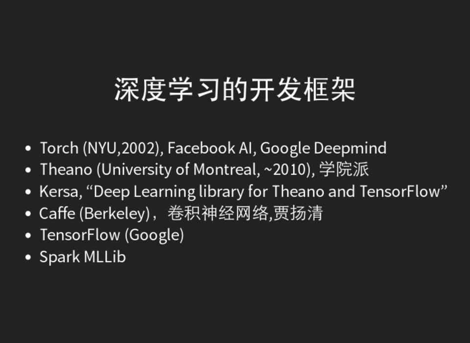 Torch (NYU,2002), Facebook AI, Google Deepmind Theano (University of Montreal, ~2010), 学院派 Kersa, “Deep Learning library for Theano and TensorFlow” Caffe (Berkeley),卷积神经网络,贾扬清 TensorFlow (Google) Spark MLLib