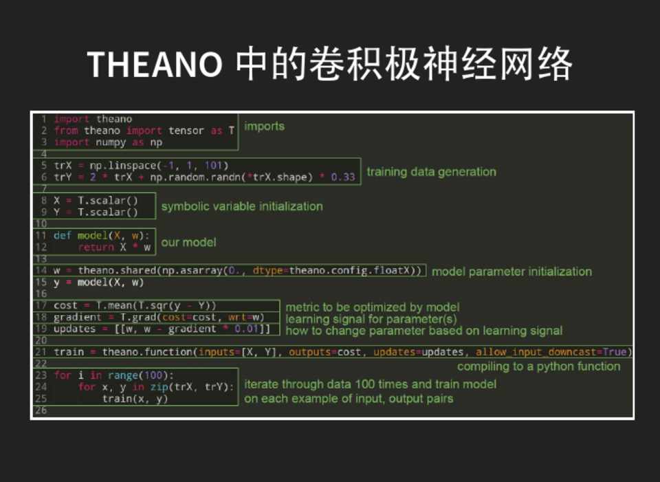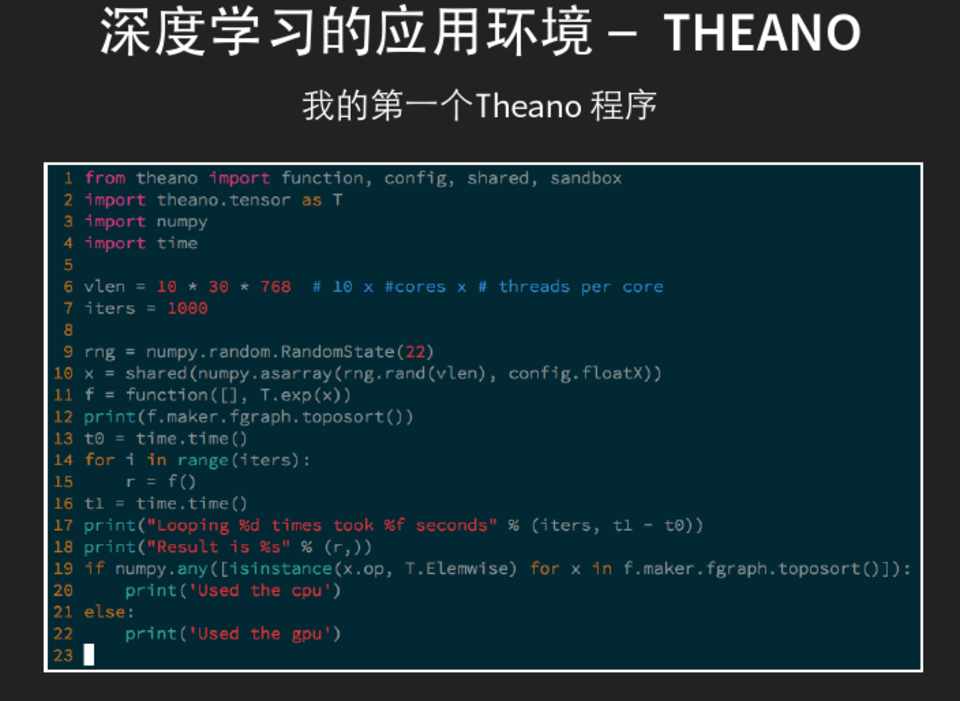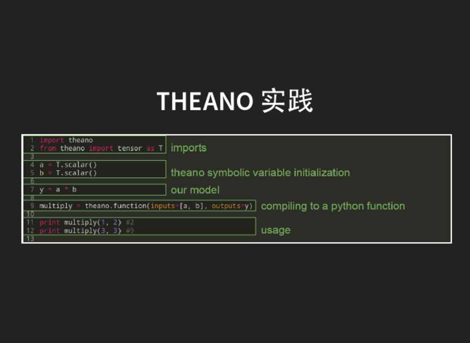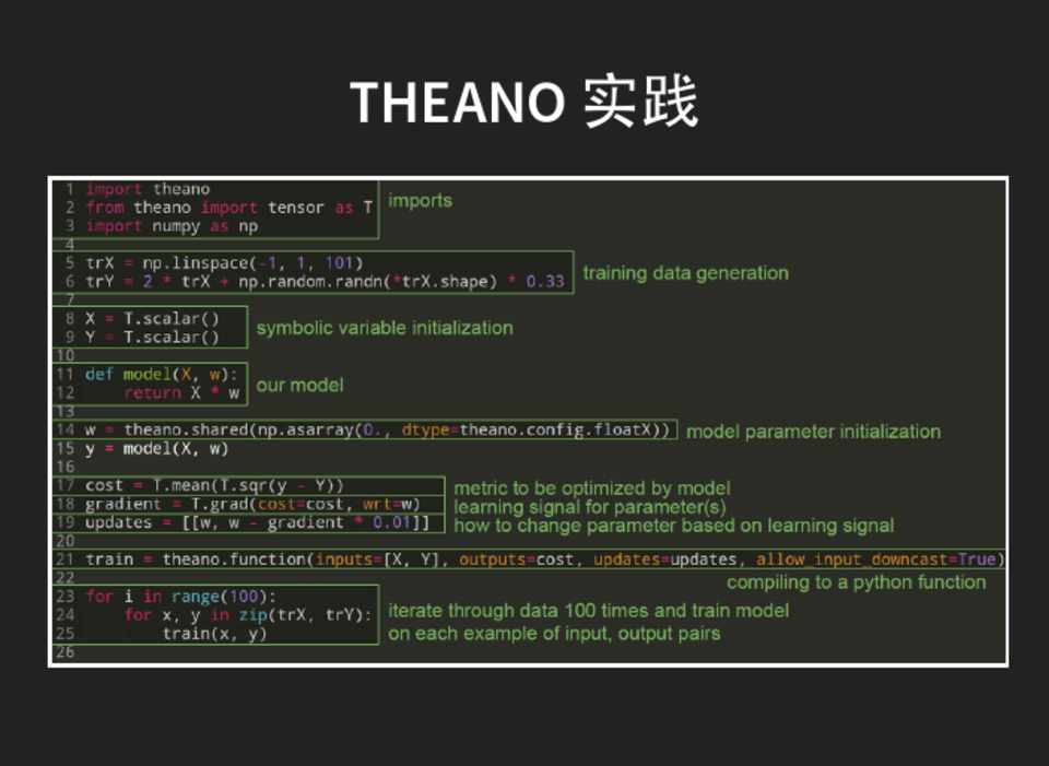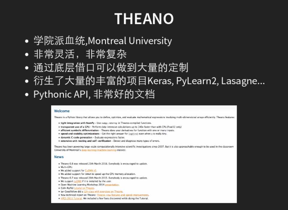学院派血统,Montreal University 非常灵活,非常复杂 通过底层借口可以做到大量的定制 衍生了大量的丰富的项目Keras, PyLearn2, Lasagne... Pythonic API, 非常好的文档