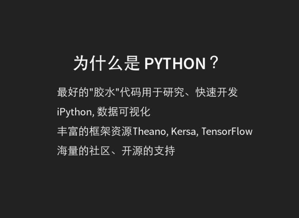 最好的"胶水"代码用于研究、快速开发 iPython, 数据可视化 丰富的框架资源Theano, Kersa, TensorFlow 海量的社区、开源的支持
