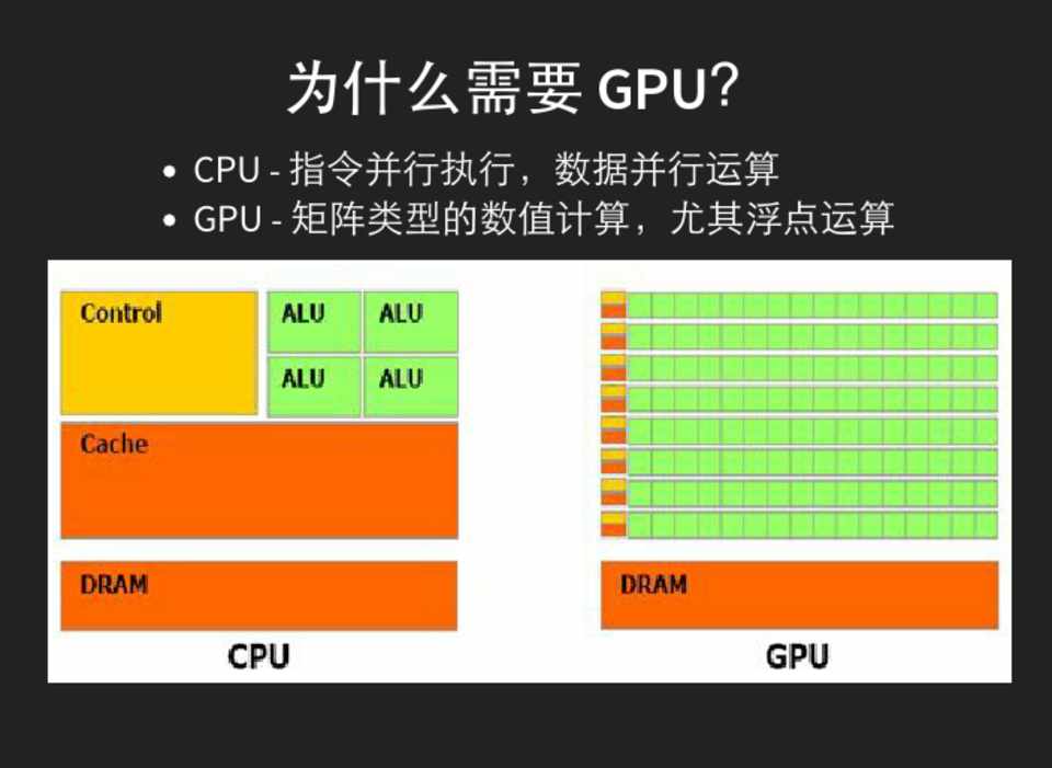 CPU - 指令并行执行,数据并行运算 GPU - 矩阵类型的数值计算,尤其浮点运算