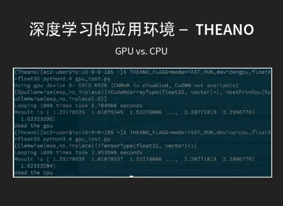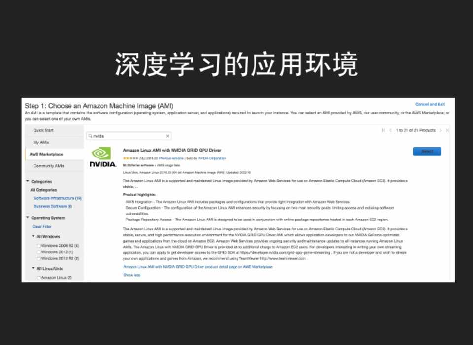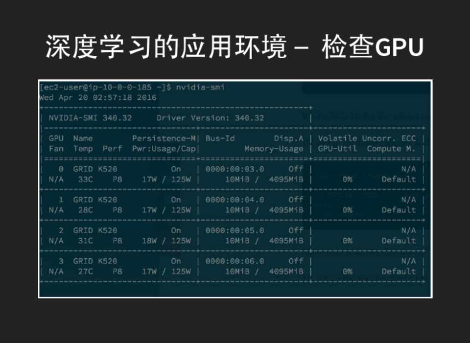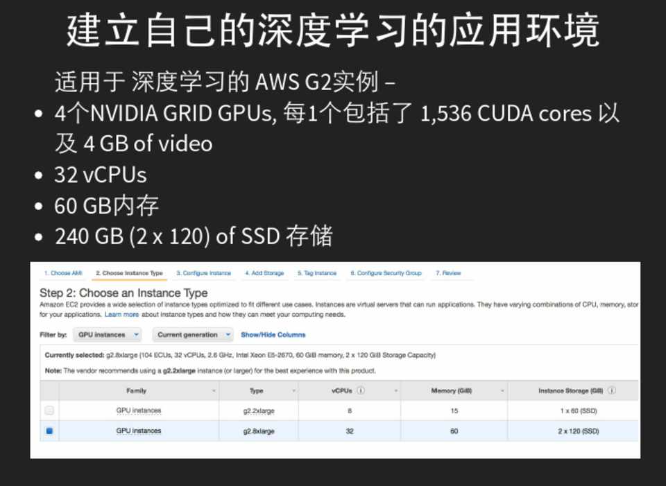 适用于 深度学习的 AWS G2实例 – 4个NVIDIA GRID GPUs, 每1个包括了 1,536 CUDA cores 以 及 4 GB of video 32 vCPUs 60 GB内存 240 GB (2 x 120) of SSD 存储