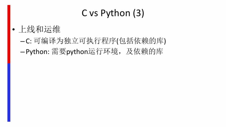 – C: 可编译为独立可执行程序(包括依赖的库) – Python: 需要python运行环境,及依赖的库
