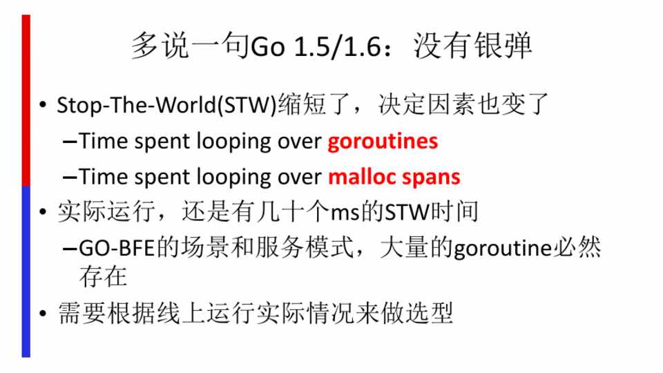 • Stop-The-World(STW)缩短了,决定因素也变了 –Time spent looping over goroutines –Time spent looping over malloc spans