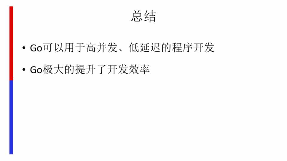 • Go可以用于高并发、低延迟的程序开发 • Go极大的提升了开发效率