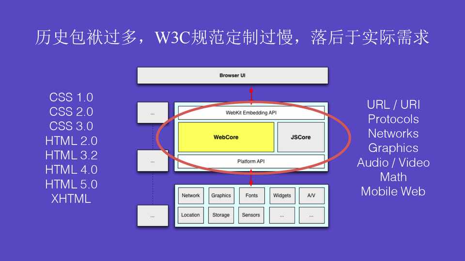 历史包袱过多,W3C规范定制过慢,落后于实际需求