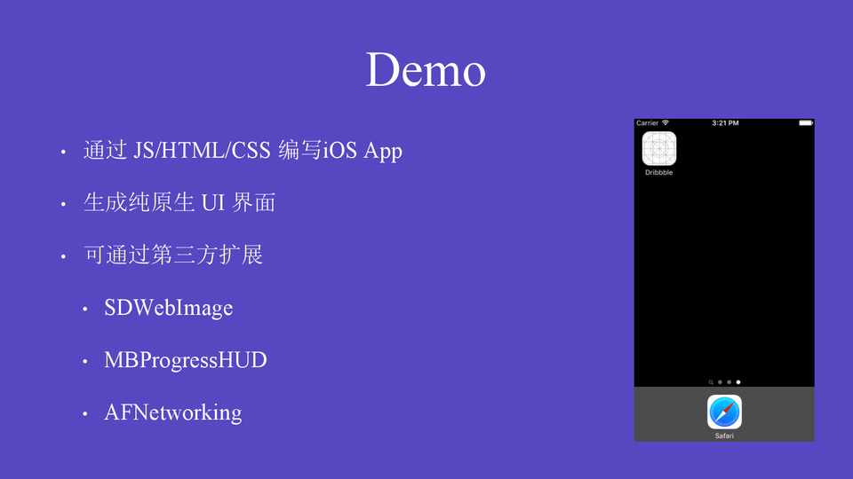 • 通过 JS/HTML/CSS 编写iOS App • 生成纯原生 UI 界面 • 可通过第三方扩展