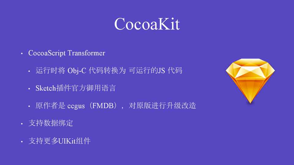 • CocoaScript Transformer • 运行时将 Obj-C 代码转换为 可运行的JS 代码 • Sketch插件官方御用语言 • 原作者是 ccgus(FMDB),对原版进行升级改造