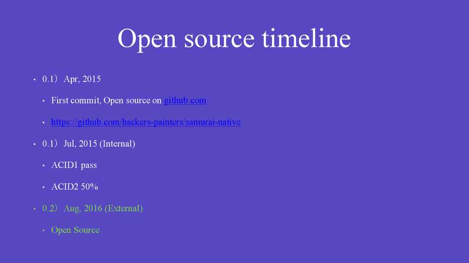 • 0.1)Apr, 2015 • First commit, Open source on github.com • https://github.com/hackers-painters/samurai-native