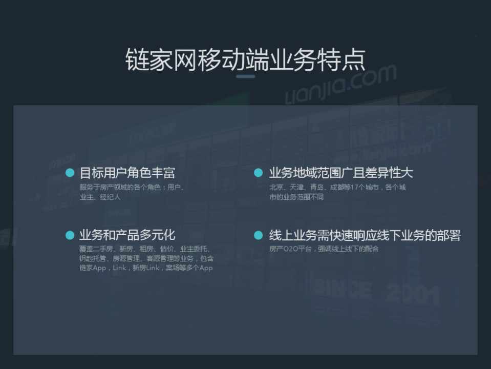 覆盖二手房、新房、租房、估价、业主委托、 钥匙托管、房源管理、客源管理等业务,包含 链家App,Link,新房Link,案场等多个App