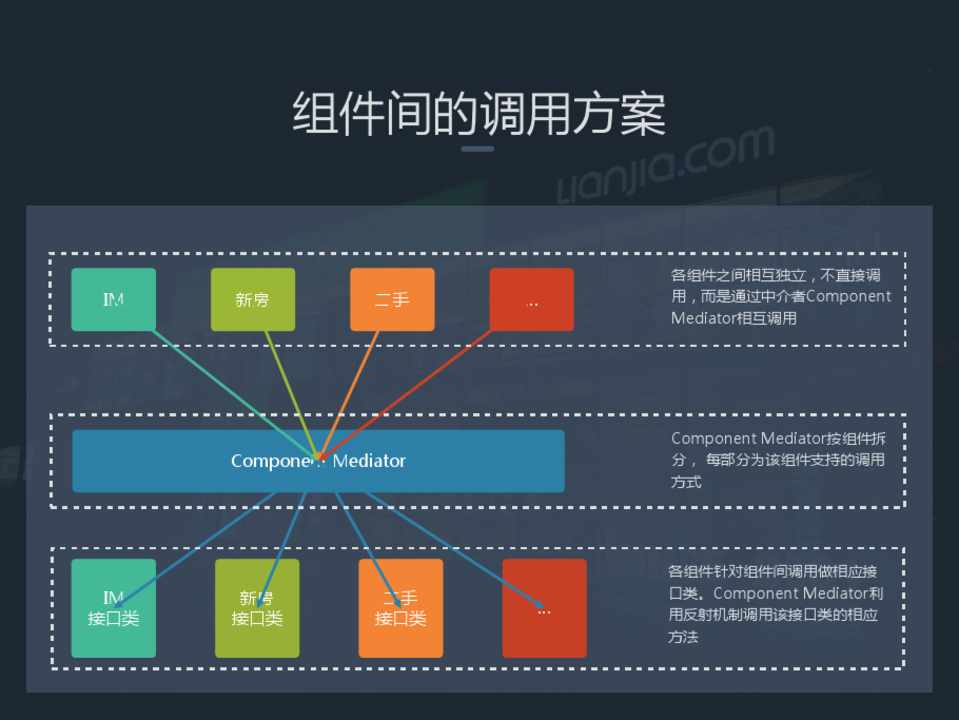 各组件针对组件间调用做相应接 口类。Component Mediator利 用反射机制调用该接口类的相应 方法