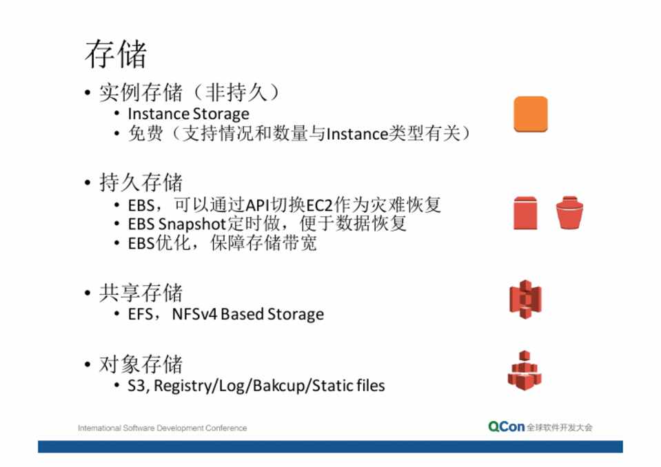 • EBS,可以通过API切换EC2作为灾难恢复 • EBSSnapshot定时做,便于数据恢复 • EBS优化,保障存储带宽