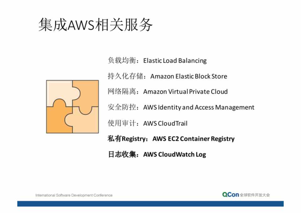负载均衡:ElasticLoadBalancing 持久化存储:AmazonElasticBlockStore 网络隔离:AmazonVirtualPrivateCloud 安全防控:AWSIdentityandAccessManagement 使用审计:AWSCloudTrail 私有Registry:AWS EC2 Container Registry 日志收集:AWSCloudWatch Log