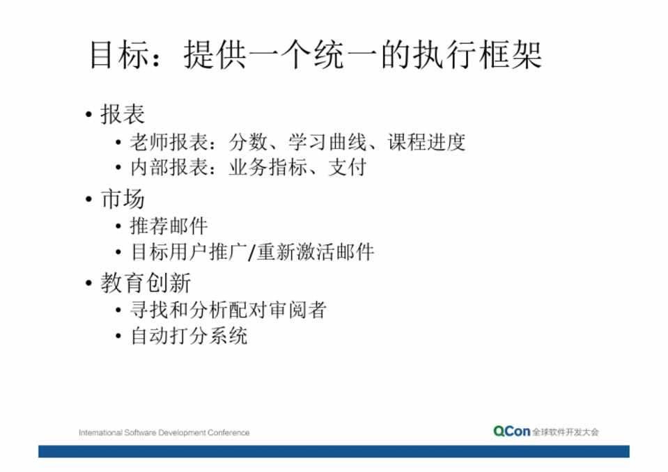 • 老师报表:分数、学习曲线、课程进度 • 内部报表:业务指标、支付