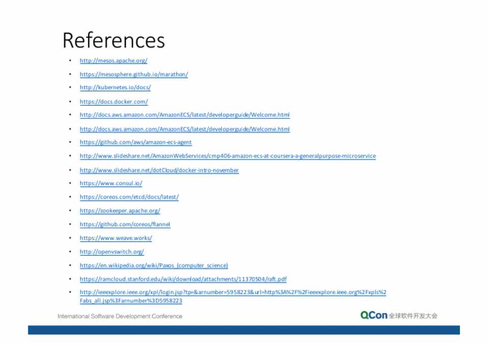 • http://mesos.apache.org/ • https://mesosphere.github.io/marathon/ • http://kubernetes.io/docs/ • https://docs.docker.com/ • http://docs.aws.amazon.com/AmazonECS/latest/developerguide/Welcome.html • http://docs.aws.amazon.com/AmazonECS/latest/developerguide/Welcome.html • https://github.com/aws/amazon-ecs-agent • http://www.slideshare.net/AmazonWebServices/cmp406-amazon-ecs-at-coursera-a-generalpurpose-microservice • http://www.slideshare.net/dotCloud/docker-intro-november • https://www.consul.io/ • https://coreos.com/etcd/docs/latest/ • https://zookeeper.apache.org/ • https://github.com/coreos/flannel • https://www.weave.works/ • http://openvswitch.org/ • https://en.wikipedia.org/wiki/Paxos_(computer_science) • https://ramcloud.stanford.edu/wiki/download/attachments/11370504/raft.pdf • http://ieeexplore.ieee.org/xpl/login.jsp?tp=&arnumber=5958223&url=http%3A%2F%2Fieeexplore.ieee.org%2Fxpls%2