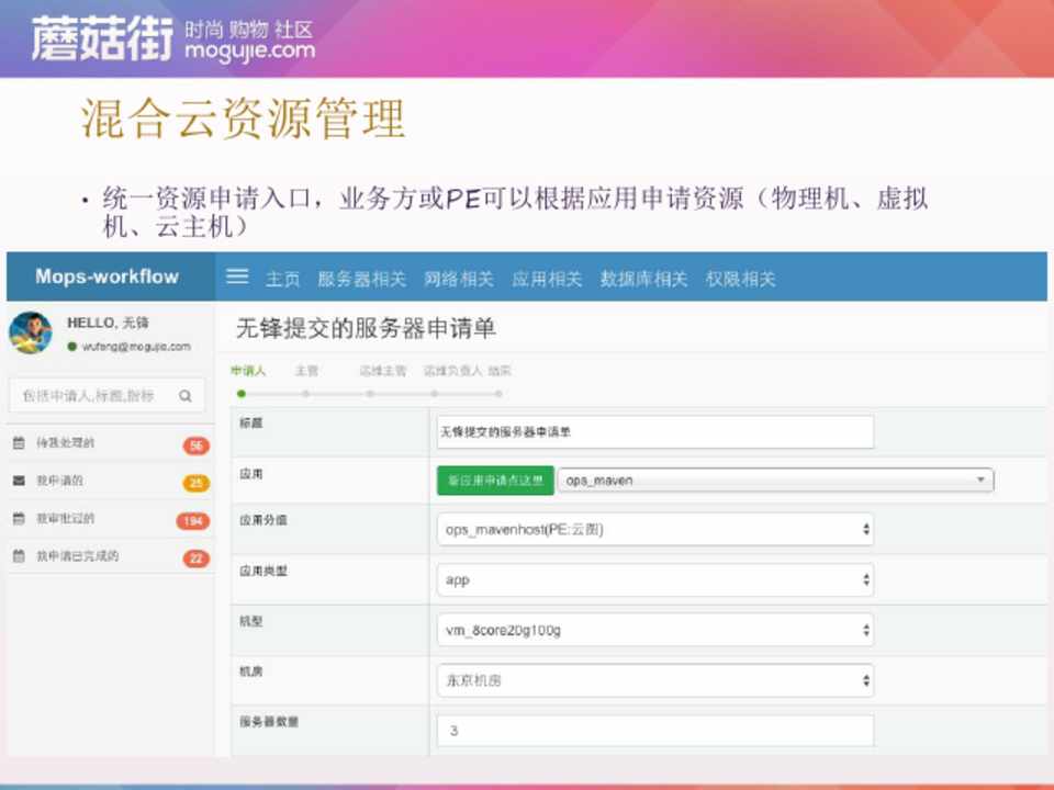 • 统一资源申请入口,业务方或PE可以根据应用申请资源(物理机、虚拟 机、云主机)