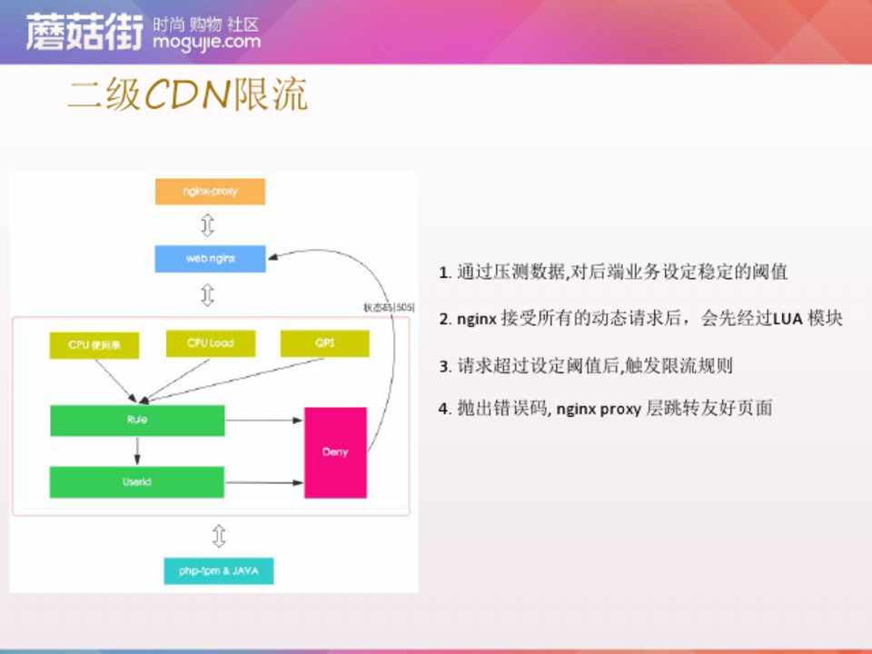 1. 通过压测数据,对后端业务设定稳定的阈值 2. nginx 接受所有的动态请求后,会先经过LUA 模块 3. 请求超过设定阈值后,触发限流规则 4. 抛出错误码, nginx proxy 层跳转友好页面