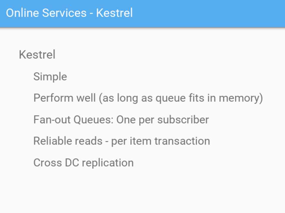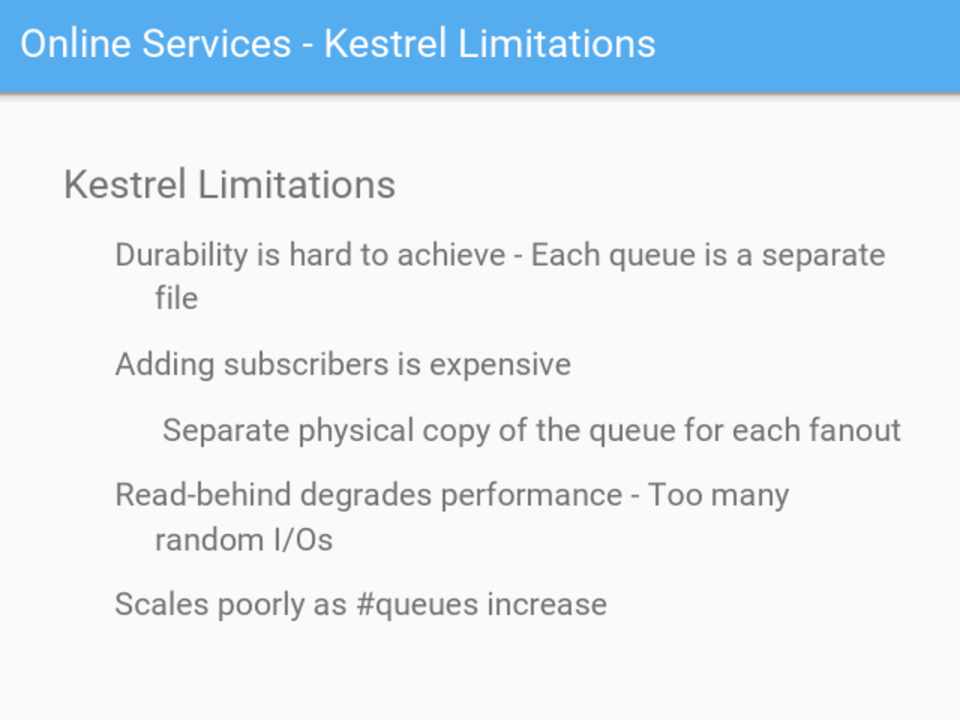 Simple Perform well (as long as queue fits in memory) Fan-out Queues: One per subscriber Reliable reads - per item transaction Cross DC replication