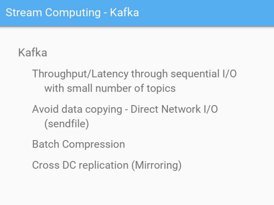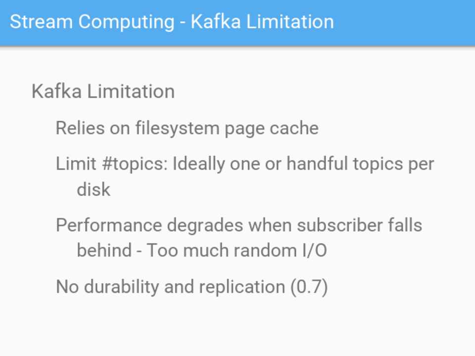 Relies on filesystem page cache Limit #topics: Ideally one or handful topics per
