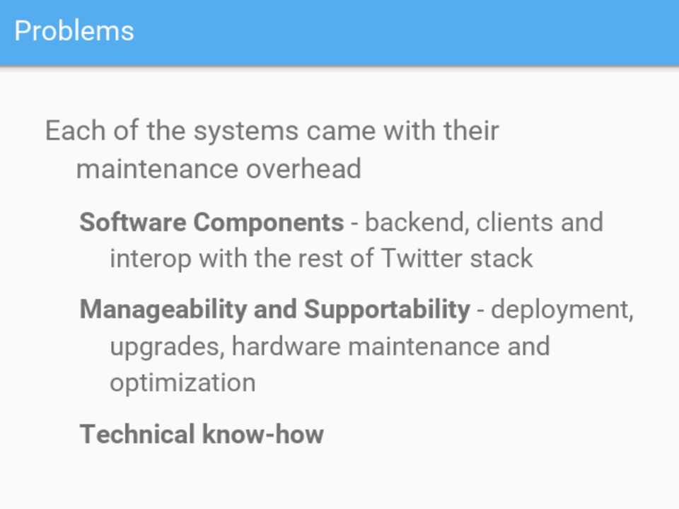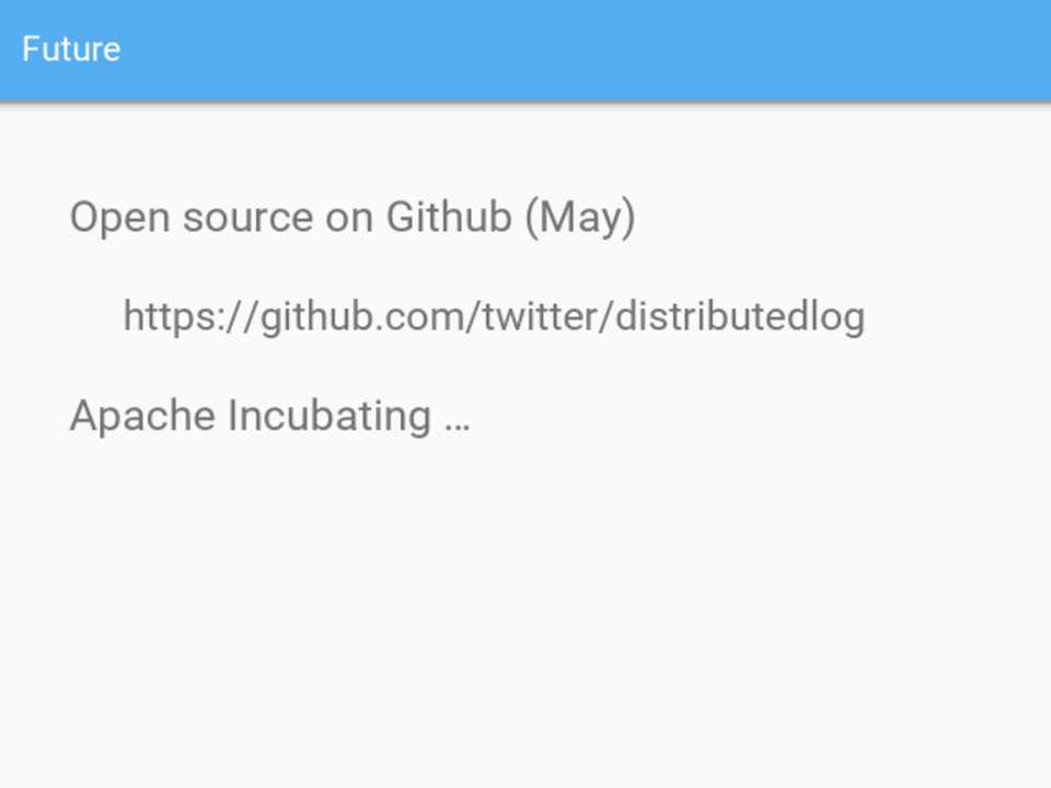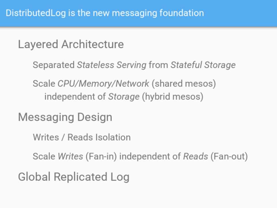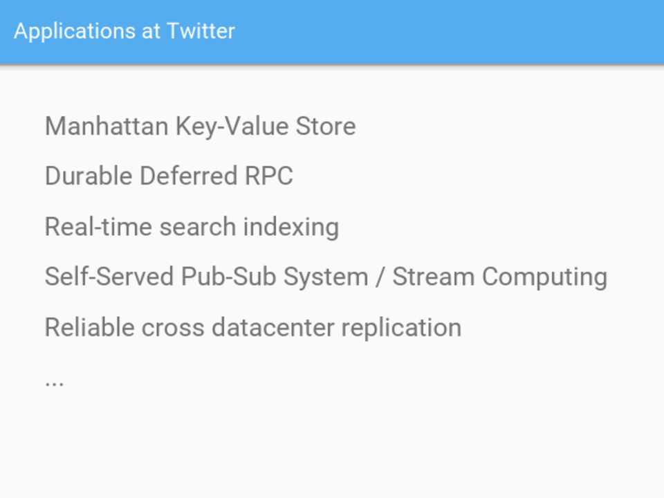 Manhattan Key-Value Store Durable Deferred RPC Real-time search indexing Self-Served Pub-Sub System / Stream Computing Reliable cross datacenter replication ...