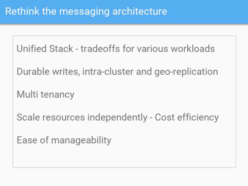 Unified Stack - tradeoffs for various workloads Durable writes, intra-cluster and geo-replication Multi tenancy Scale resources independently - Cost efficiency Ease of manageability