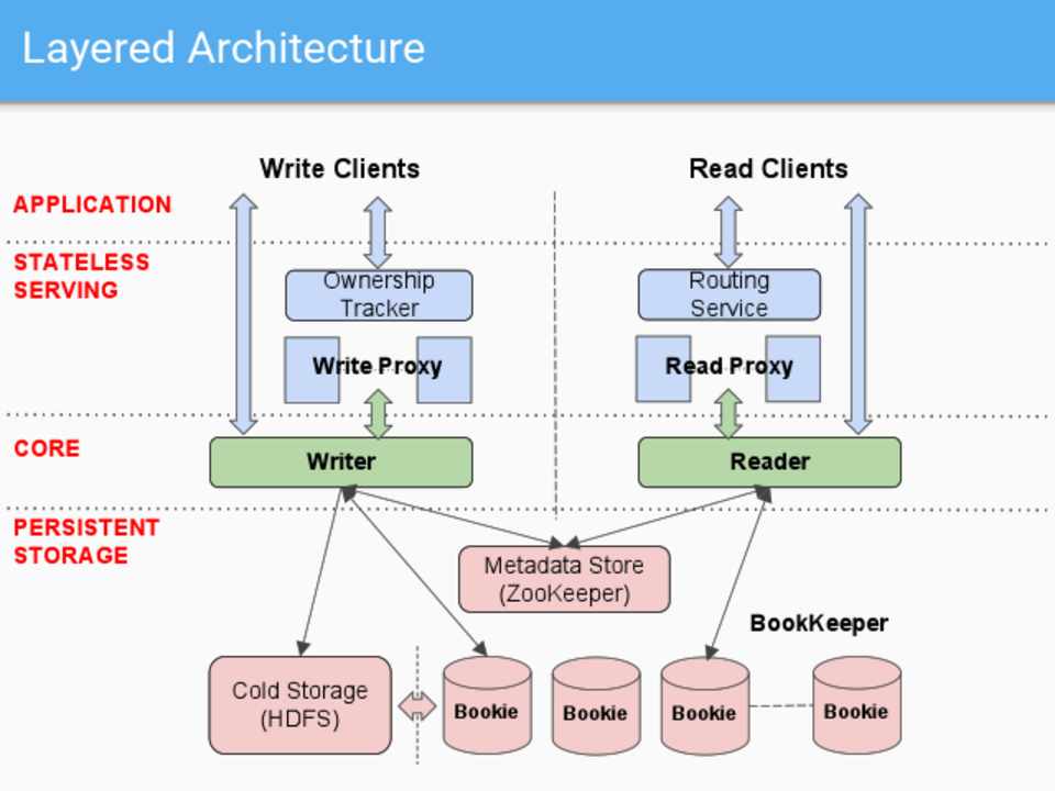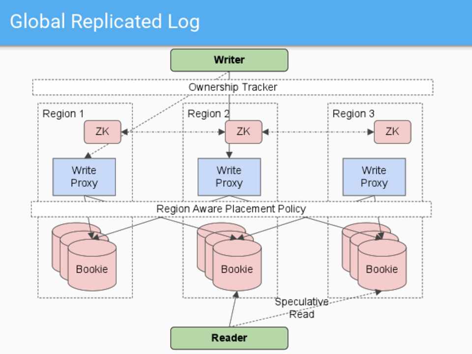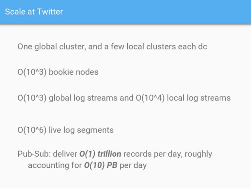 One global cluster, and a few local clusters each dc O(10^3) bookie nodes O(10^3) global log streams and O(10^4) local log streams