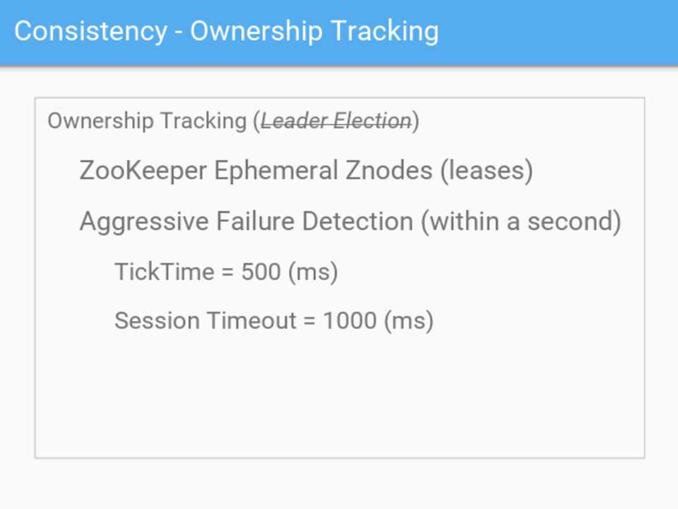 ZooKeeper Ephemeral Znodes (leases) Aggressive Failure Detection (within a second)