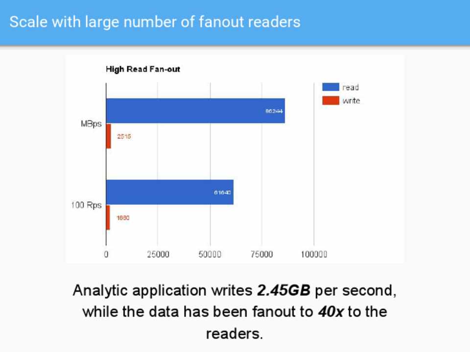 Analytic application writes 2.45GB per second, while the data has been fanout to 40x to the readers.