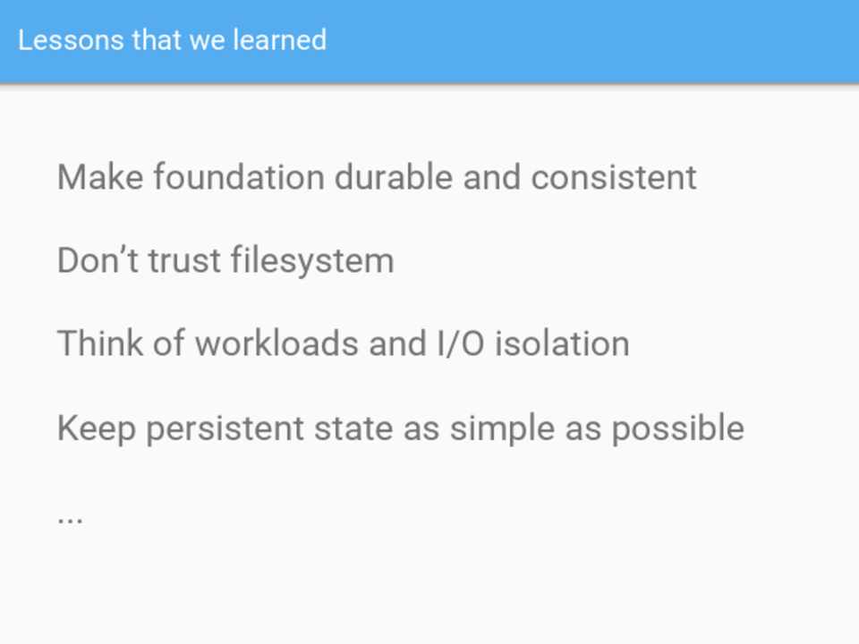 Make foundation durable and consistent Don’t trust filesystem Think of workloads and I/O isolation Keep persistent state as simple as possible ...