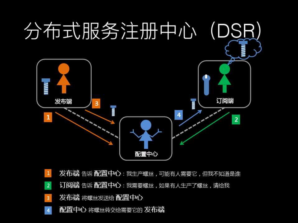 1 发布端 告诉 配置中1:2生产螺丝,可能4人需要它,但2不知道3谁 订阅端 告诉 配置中1:2需要螺丝,如果4人生产了螺丝,请给2 3 发布端 将螺丝发送给 配置中1 4 配置中1 将螺丝转交给需要它的 发布端