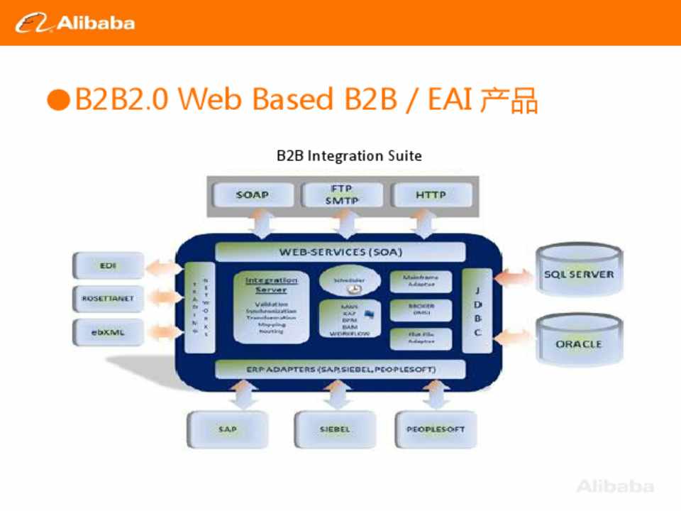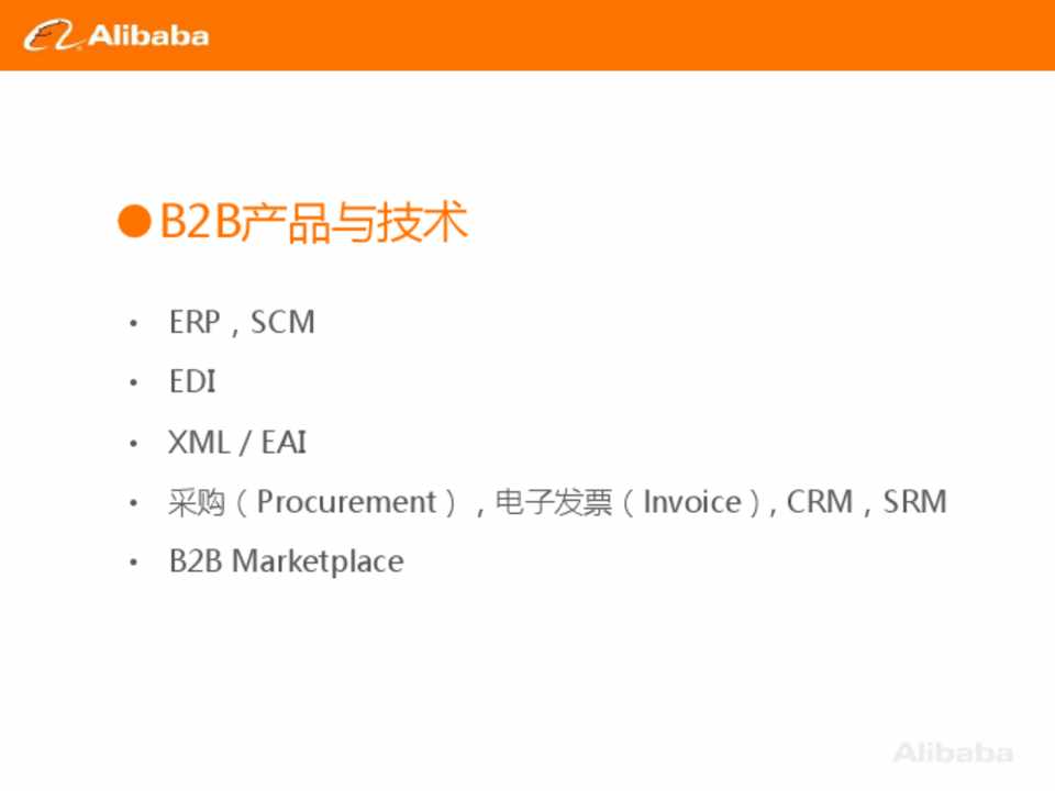 • ERP,SCM • EDI • XML/EAI • 采购(Procurement),电子发票(lnvoice), CRM,SRM • B2B Marketplace
