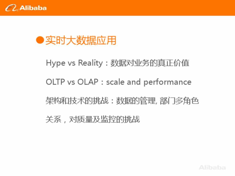 Hype vs Reality:数据对业务的真正价值 OLTP vs OLAP:scale and performance 架构和技术的挑战:数据的管理, 部门多角色 关系,对质量及监控的挑战