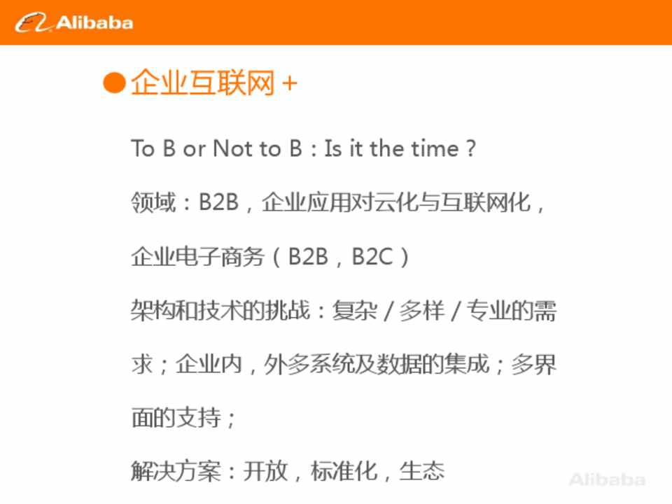 To B or Not to B:Is it the time? 领域:B2B,企业应用对云化与互联网化, 企业电子商务(B2B,B2C) 架构和技术的挑战:复杂/多样/专业的需 求;企业内,外多系统及数据的集成;多界 面的支持; 解决方案:开放,标准化,生态