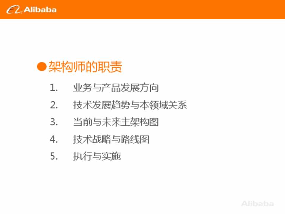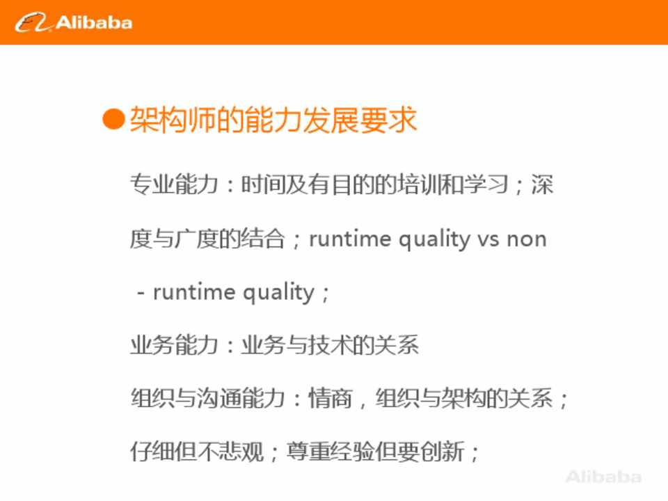 专业能力:时间及有目的的培训和学习;深 度与广度的结合;runtime quality vs non -runtime quality; 业务能力:业务与技术的关系 组织与沟通能力:情商,组织与架构的关系; 仔细但不悲观;尊重经验但要创新;