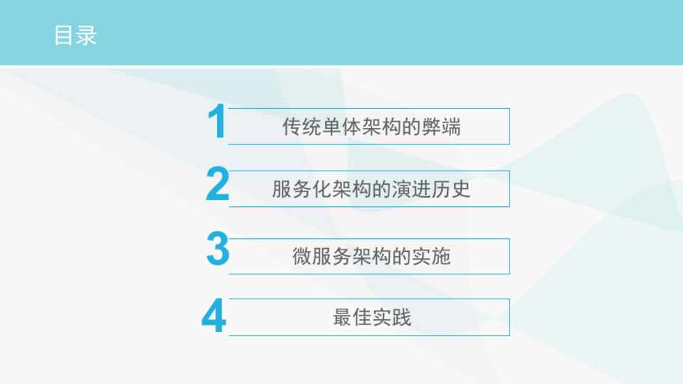 1 传统单体架构的弊端 2 服务化架构的演进历史 3 微服务架构的实施 4 最佳实践