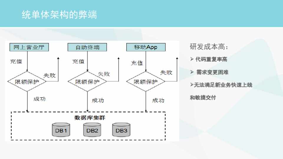 Ø 代码重复率高 Ø 需求变更困难 Ø无法满足新业务快速上线 和敏捷交付