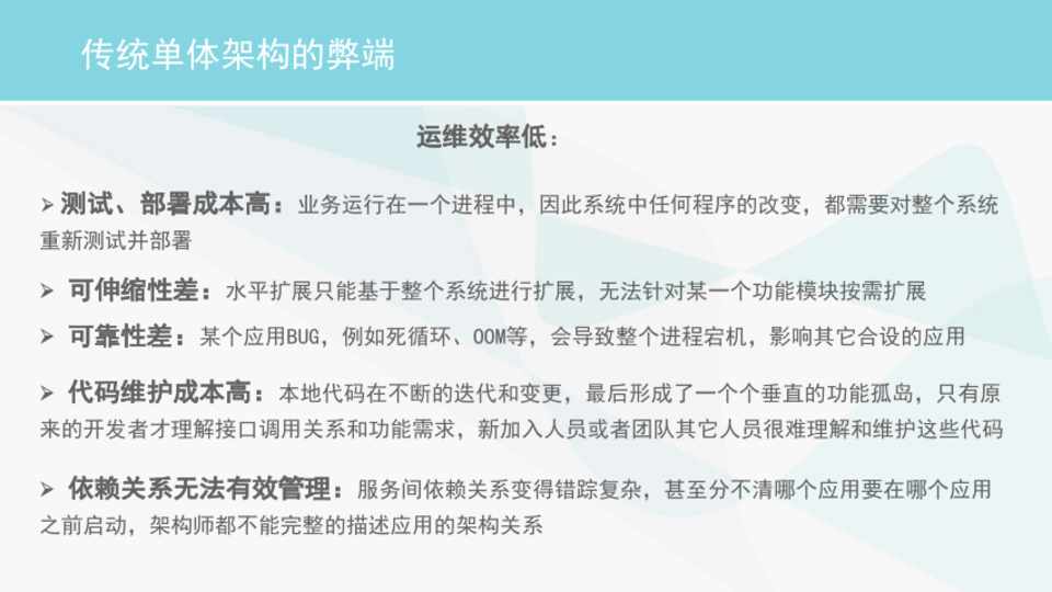 Ø 可伸缩性差:水平扩展只能基于整个系统进行扩展,无法针对某一个功能模块按需扩展 Ø 可靠性差:某个应用BUG,例如死循环、OOM等,会导致整个进程宕机,影响其它合设的应用 Ø 代码维护成本高:本地代码在不断的迭代和变更,最后形成了一个个垂直的功能孤岛,只有原