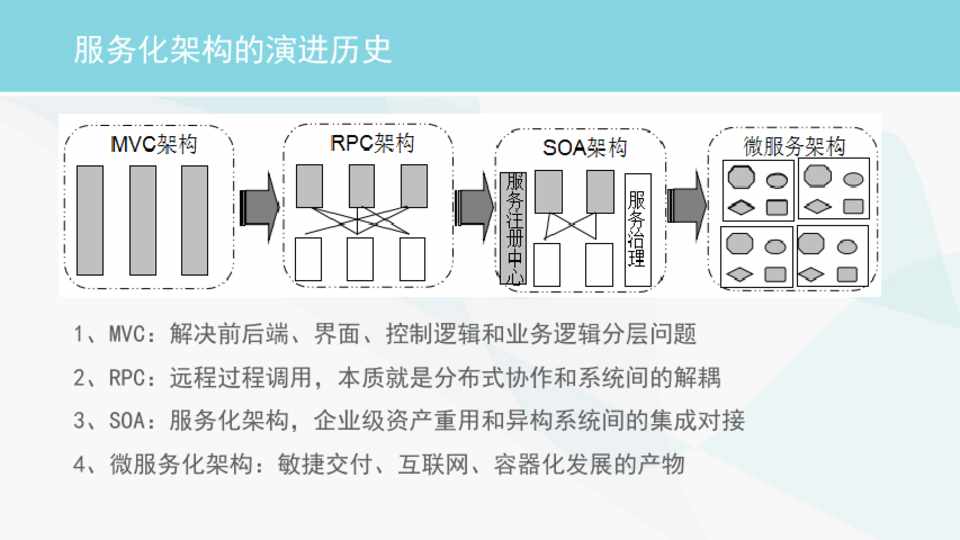 1、MVC:解决前后端、界面、控制逻辑和业务逻辑分层问题 2、RPC:远程过程调用,本质就是分布式协作和系统间的解耦 3、SOA:服务化架构,企业级资产重用和异构系统间的集成对接 4、微服务化架构:敏捷交付、互联网、容器化发展的产物