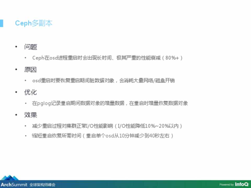 • Ceph在osd进程重启时会出现长时间、极其严重的性能衰减(80%+)