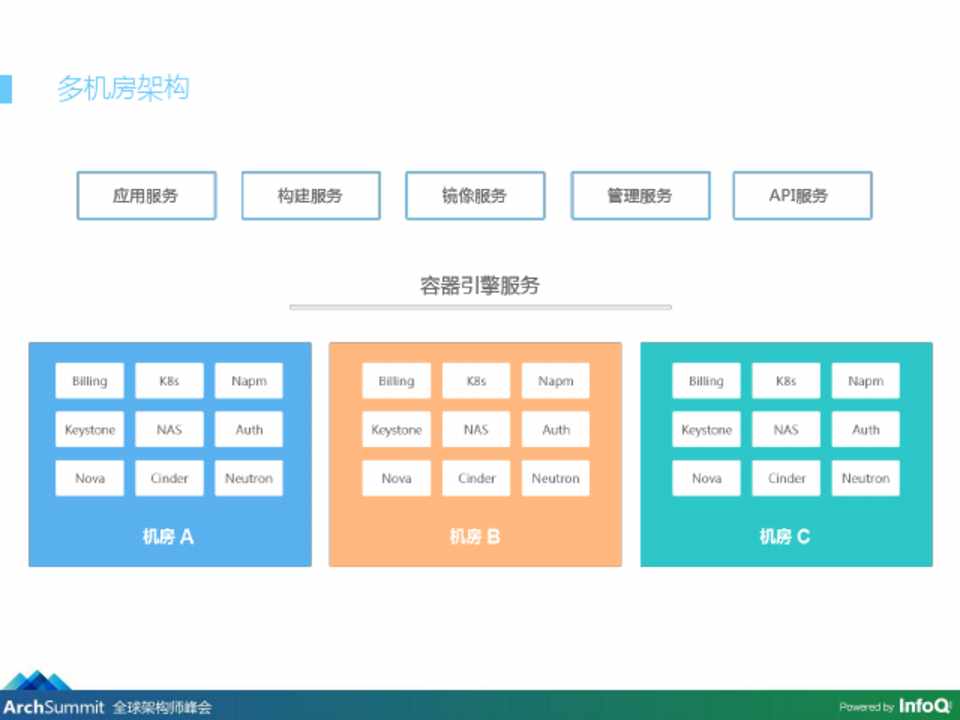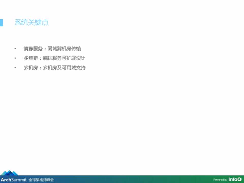 • 镜像服务:同城跨机房传输 • 多集群:编排服务可扩展设计 • 多机房:多机房及可用域支持