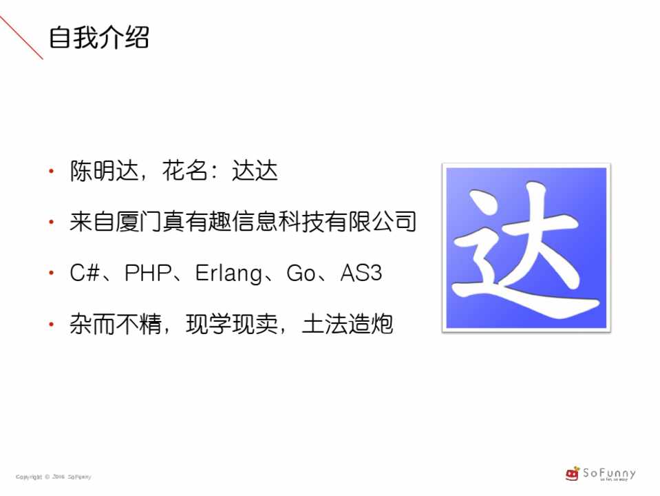 • 陈明达,花名:达达 • 来自厦门真有趣信息科技有限公司 • C#、PHP、Erlang、Go、AS3 • 杂而不精,现学现卖,土法造炮