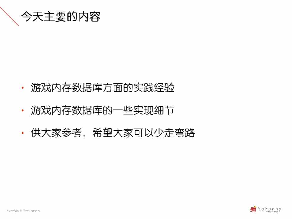 • 游戏内存数据库方面的实践经验 • 游戏内存数据库的一些实现细节 • 供大家参考,希望大家可以少走弯路