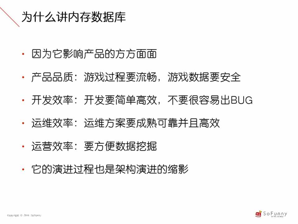 • 因为它影响产品的方方面面 • 产品品质:游戏过程要流畅,游戏数据要安全 • 开发效率:开发要简单高效,不要很容易出BUG • 运维效率:运维方案要成熟可靠并且高效 • 运营效率:要方便数据挖掘 • 它的演进过程也是架构演进的缩影