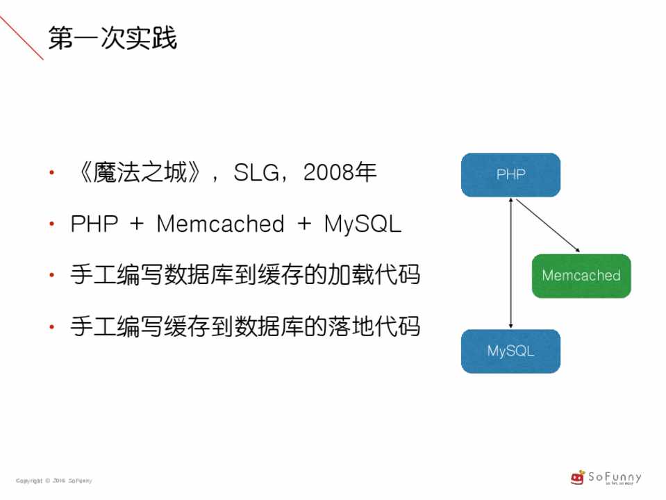 • 《魔法之城》,SLG,2008年 • PHP + Memcached + MySQL • 手工编写数据库到缓存的加载代码 • 手工编写缓存到数据库的落地代码
