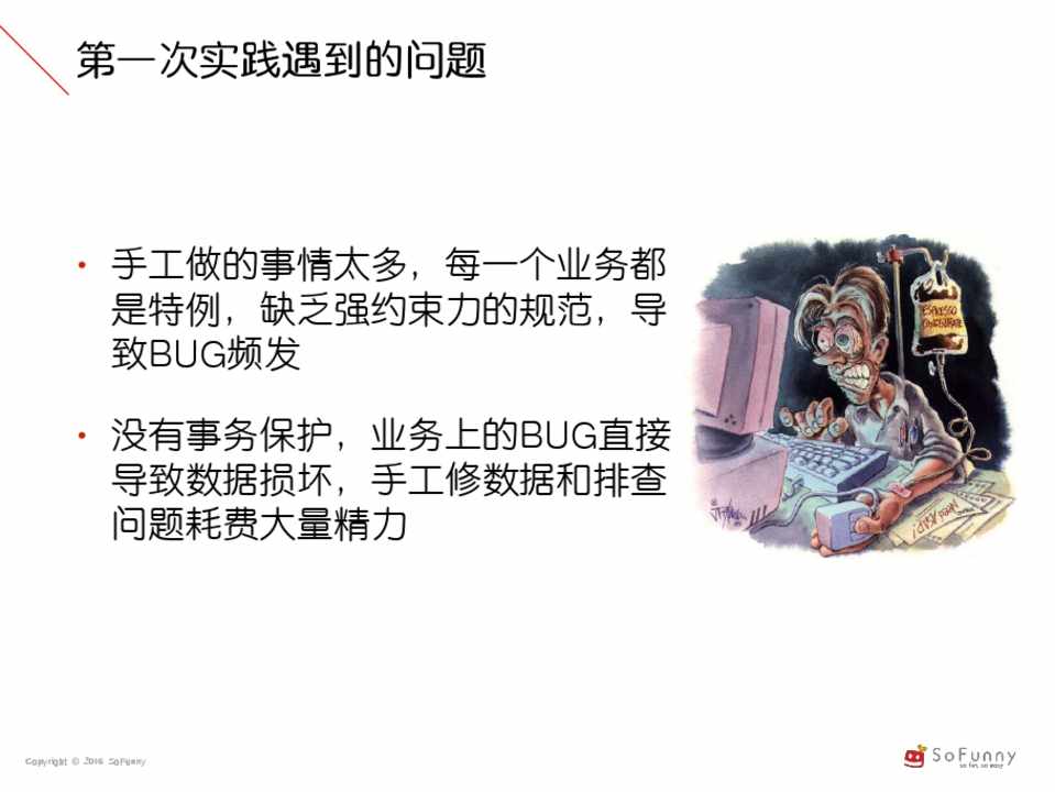 • 没有事务保护,业务上的BUG直接 导致数据损坏,手工修数据和排查 问题耗费大量精力
