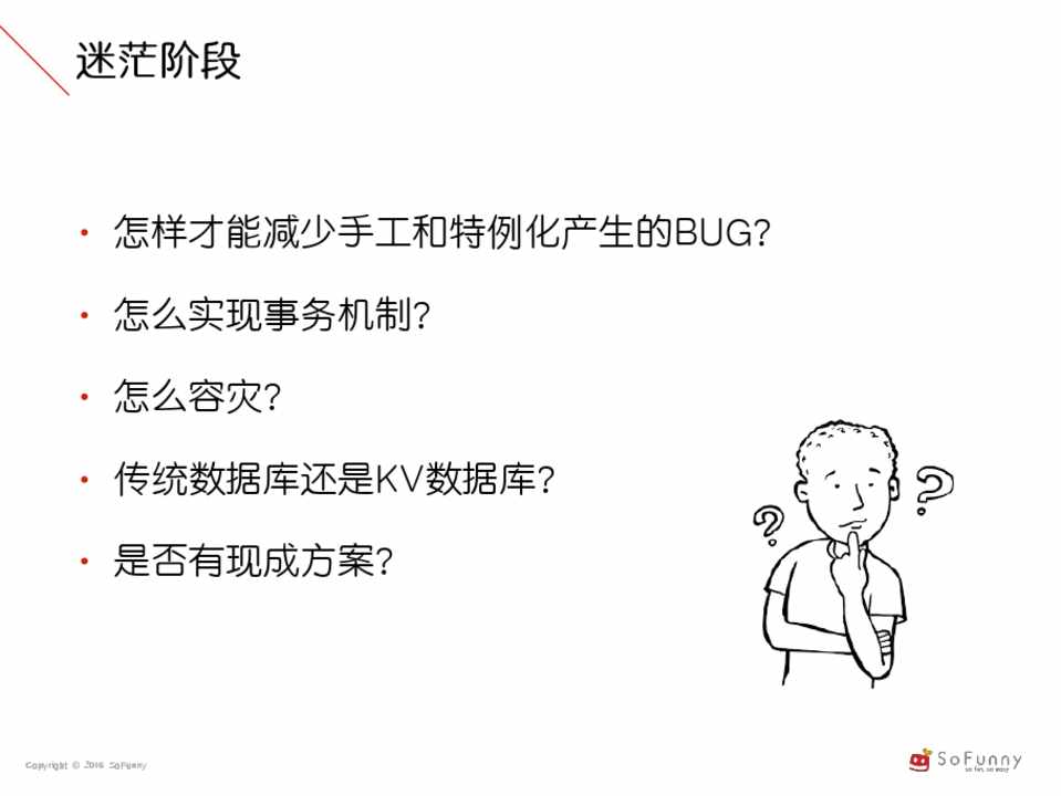 • 怎样才能减少手工和特例化产生的BUG? • 怎么实现事务机制? • 怎么容灾? • 传统数据库还是KV数据库? • 是否有现成方案?