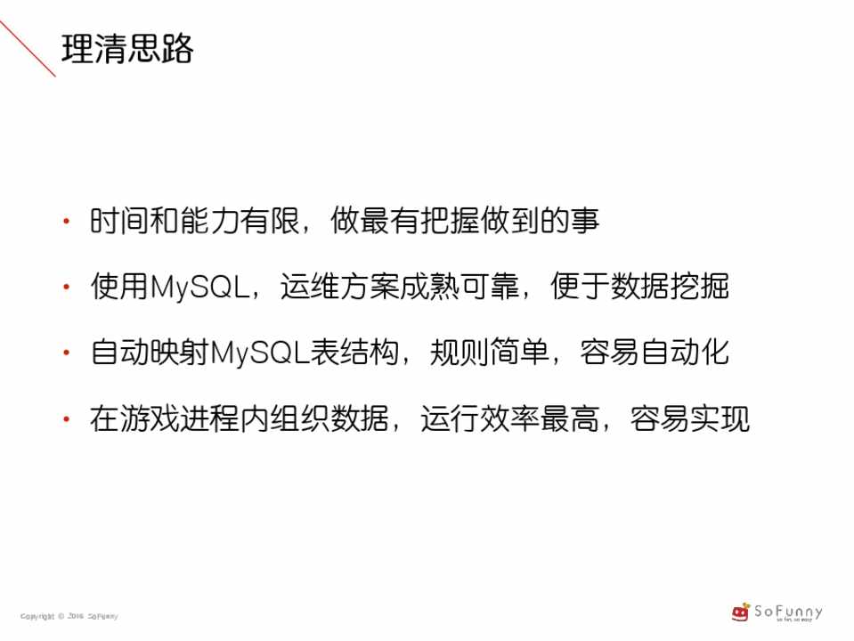 • 时间和能力有限,做最有把握做到的事 • 使用MySQL,运维方案成熟可靠,便于数据挖掘 • 自动映射MySQL表结构,规则简单,容易自动化 • 在游戏进程内组织数据,运行效率最高,容易实现