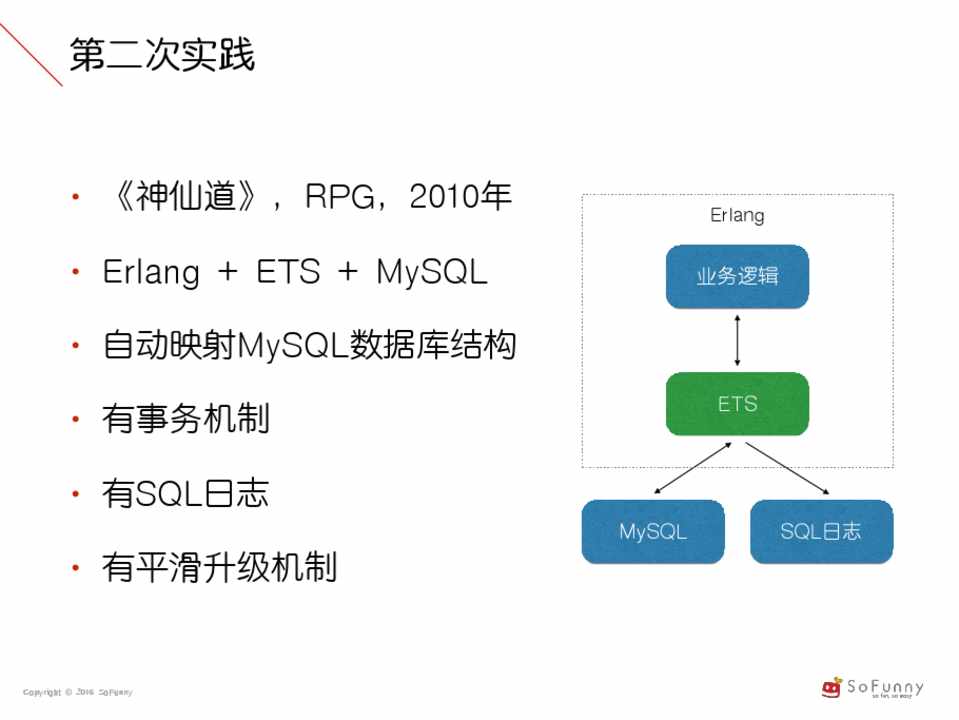 • 《神仙道》,RPG,2010年 • Erlang + ETS + MySQL • 自动映射MySQL数据库结构 • 有事务机制 • 有SQL日志 • 有平滑升级机制