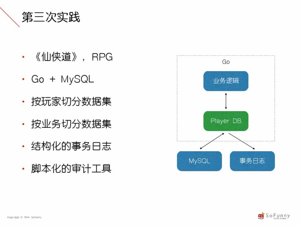 • 《仙侠道》,RPG • Go + MySQL • 按玩家切分数据集 • 按业务切分数据集 • 结构化的事务日志 • 脚本化的审计工具