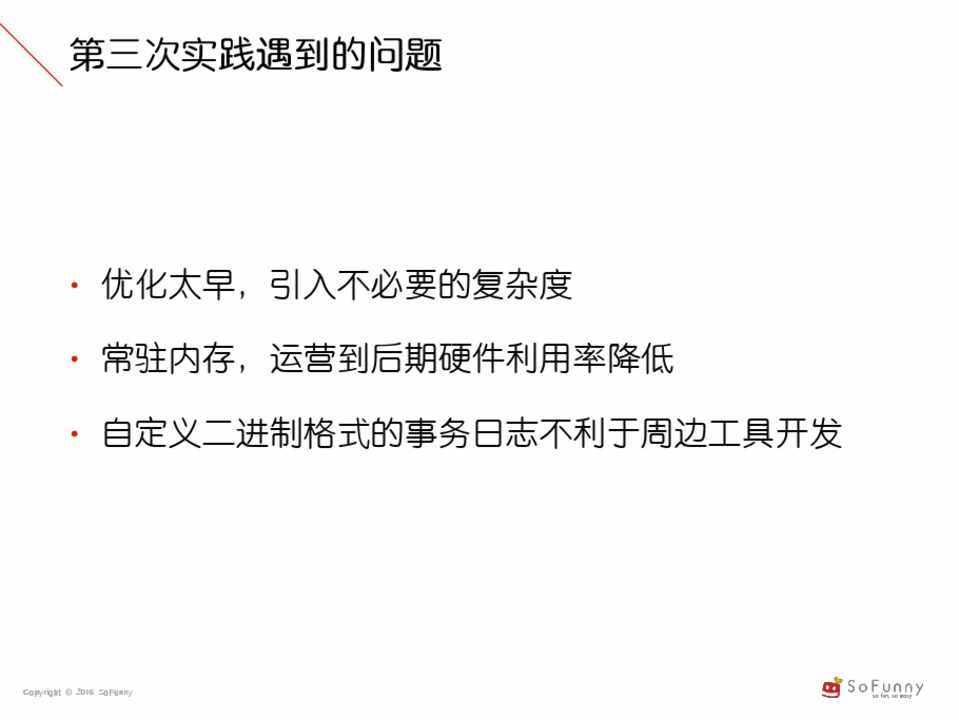 • 优化太早,引入不必要的复杂度 • 常驻内存,运营到后期硬件利用率降低 • 自定义二进制格式的事务日志不利于周边工具开发