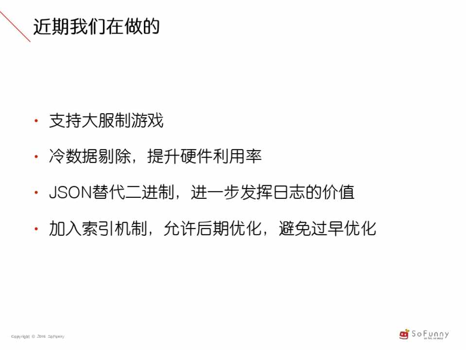 • 支持大服制游戏 • 冷数据剔除,提升硬件利用率 • JSON替代二进制,进一步发挥日志的价值 • 加入索引机制,允许后期优化,避免过早优化
